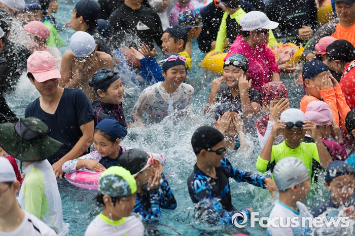 (서울=포커스뉴스) 30일 오전 서울 마포구 망원한강공원 수영장을 찾은 시민들이 물놀이를 즐기고 있다.