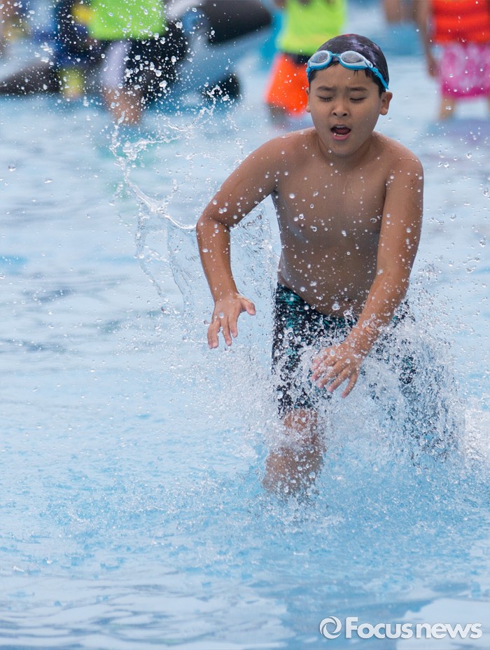 (서울=포커스뉴스) 30일 오전 서울 마포구 망원한강공원 수영장을 찾은 시민들이 물놀이를 즐기고 있다.