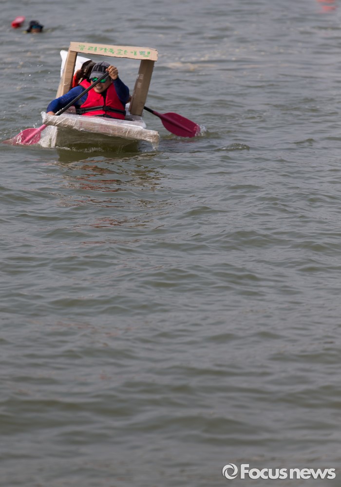 (서울=포커스뉴스) 30일 오후 서울 송파구 잠실한강공원에서 열린 한강 종이배 경주대회 '박스원레이스'에 참가한 시민들이 노를 젓고 있다.
