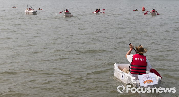 (서울=포커스뉴스) 30일 오후 서울 송파구 잠실한강공원에서 열린 한강 종이배 경주대회 '박스원레이스'에 참가한 시민들이 종이배를 타고 경주를 하고 있다.