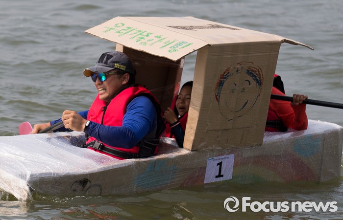 (서울=포커스뉴스) 30일 오후 서울 송파구 잠실한강공원에서 열린 한강 종이배 경주대회 '박스원레이스'에 참가한 시민들이 노를 젓고 있다.