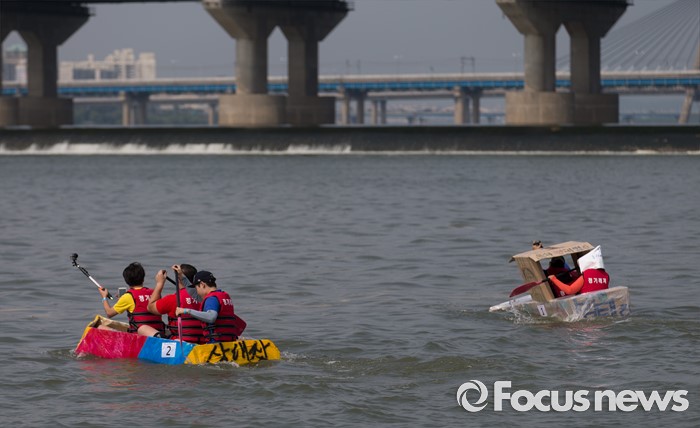(서울=포커스뉴스) 30일 오후 서울 송파구 잠실한강공원에서 열린 한강 종이배 경주대회 '박스원레이스'에 참가한 시민들이 종이배를 타고 경주를 하고 있다.
