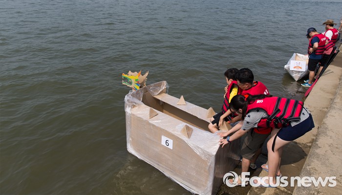 (서울=포커스뉴스) 30일 오후 서울 송파구 잠실한강공원에서 열린 한강 종이배 경주대회 '박스원레이스'에 참가한 시민들이 직접 제작한 종이배에 탑승하고 있다.