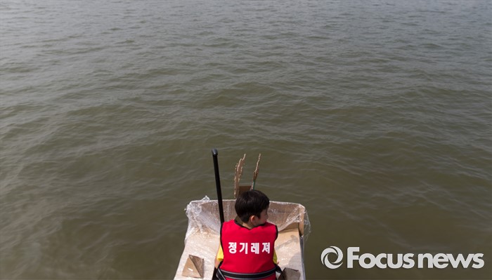 (서울=포커스뉴스) 30일 오후 서울 송파구 잠실한강공원에서 열린 한강 종이배 경주대회 '박스원레이스'에 참가한 시민들이 직접 제작한 종이배에 탑승하고 있다.