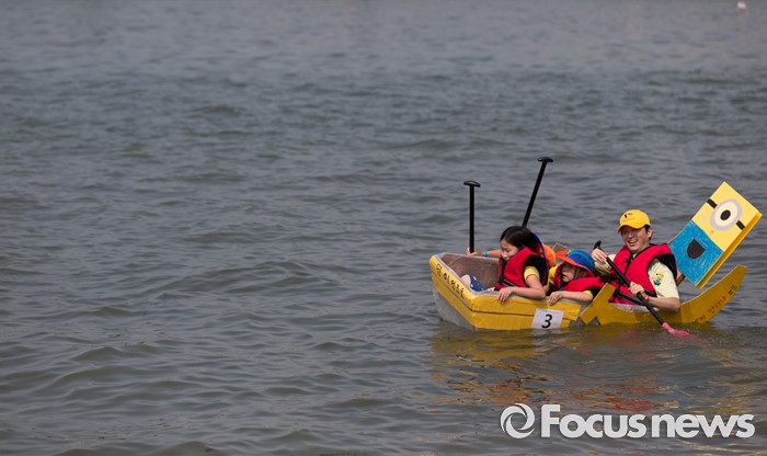 (서울=포커스뉴스) 30일 오후 서울 송파구 잠실한강공원에서 열린 한강 종이배 경주대회 '박스원레이스'에 참가한 시민들이 종이배를 타고 경주를 하고 있다.