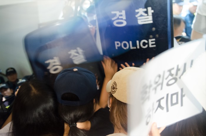 | △ 학위장사 반대 이대 학생들과 충돌하는 경찰 |