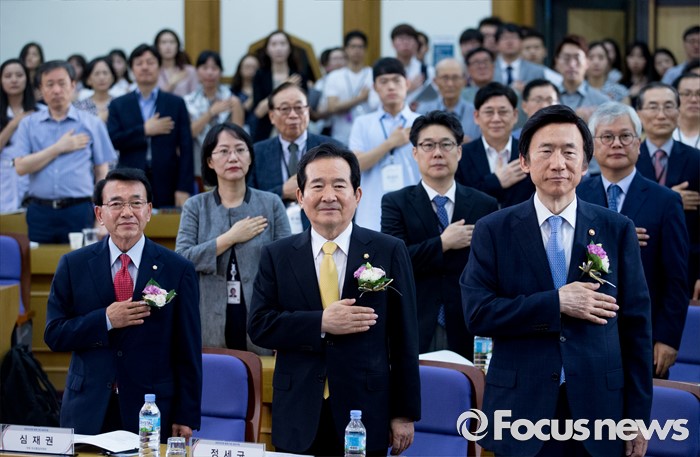 (서울=포커스뉴스) 3일 오전 서울 여의도 국회 의원회관에서 열린 공공외교법 발효기념 심포지엄에 참석한 윤병세(앞줄 오른쪽부터) 외교부 장관, 정세균 국회의장, 심재권 국회 외교통일위원장 등이 국기에 대한 경례를 하고 있다.