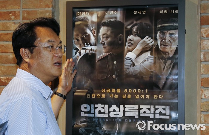 (서울=포커스뉴스) 정진석 새누리당 원내대표가 1일 오후 서울 여의도 한 영화관에서 영화 '인천상륙작전' 관람에 앞서 동료 의원들과 대화하고 있다.