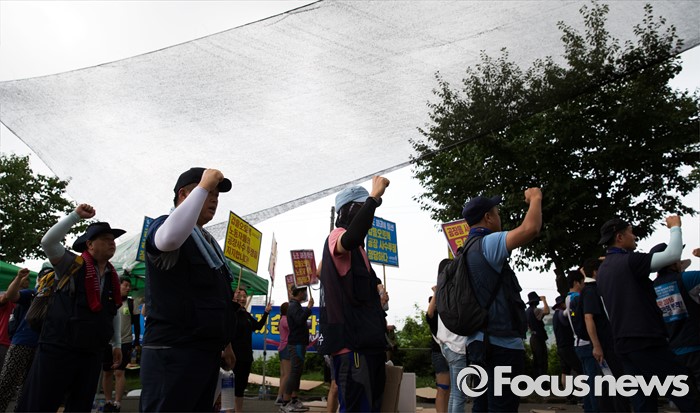 (아산=포커스뉴스) 1일 오전 충남 아산 탕정면 갑을오토텍에서 노조원들이 사측의 경비 용역 투입에 대비하고 있다.