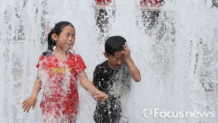 (청주=포커스뉴스) 전국 대부분 지역에 폭염특보가 내려진 1일 오후 충북 청주 오송호수공원 분수대에서 어린이들이 더위를 식히고 있다.