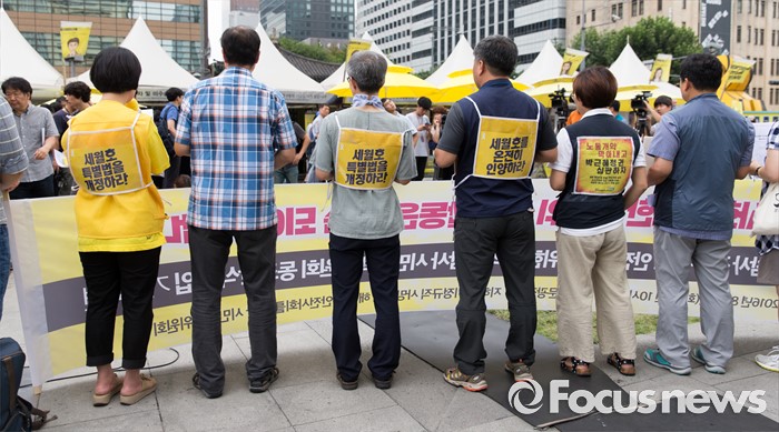 (서울=포커스뉴스) 2일 오전 서울 종로구 광화문광장에서 지하철 비정규직 사망재해 해결과 안전사회를 위한 시민대책위원회가 세월호 특조위 동조단식 돌입 기자회견을 하고 있다.