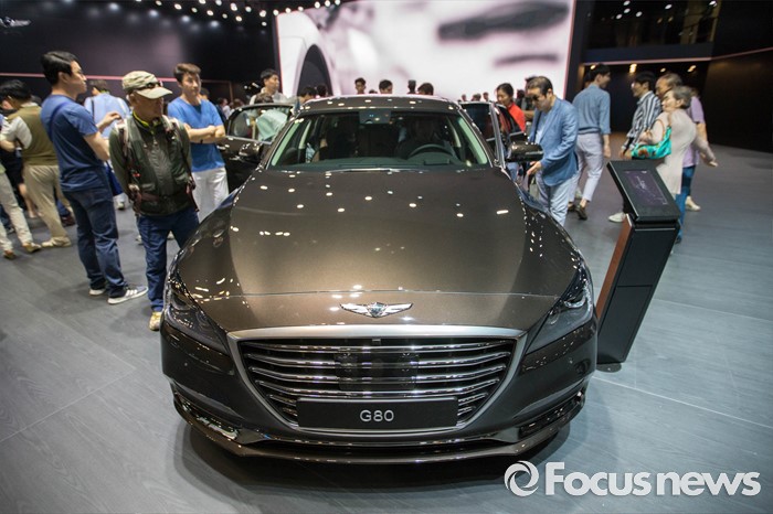 국내 공장 수출의 경우 노조창립일 등 근무일수 감소 및 생산 차질 등의 영향으로 전년 동기 대비 16.6% 감소했지만, 해외공장 판매는 주요 차종의 판매 호조 등을 바탕으로 전년 대비 5.0% 증가하며 국내 공장 수출 감소 분을 만회, 전체적으로는 2.0% 감소했다.(부산=포커스뉴스) 부산 해운대구에 위치한 벡스코에서 열린 '2016 부산국제모터쇼'에 제네시스 'G80' 차량이 전시되어 있다. 2016.06.04 성동훈 기자r