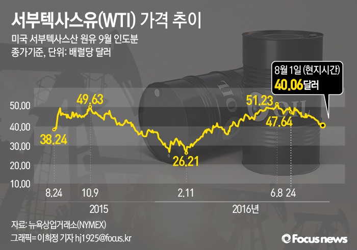 1일(현지시간) 뉴욕상업거래소에서 9월물 서부텍사스산 원유(WTI) 가격은 지난 주말보다 배럴당 1.54달러(3.7%) 하락한 40.06달러를 기록했다. 이는 지난 4월20일 이후 최저치다.