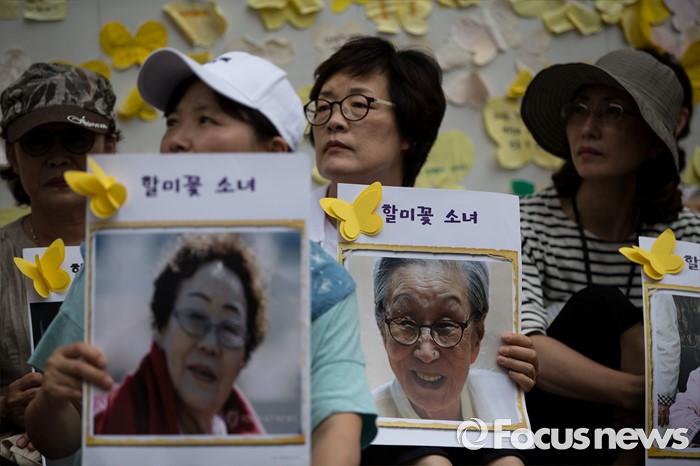 (서울=포커스뉴스) 3일 오후 서울 종로구 구 일본대사관 앞에서 열린 '제1242차 일본군 위안부 문제해결을 위한 정기 수요집회'에 참석한 시민들이 위안부 피해자 손 피켓을 들고 있다.