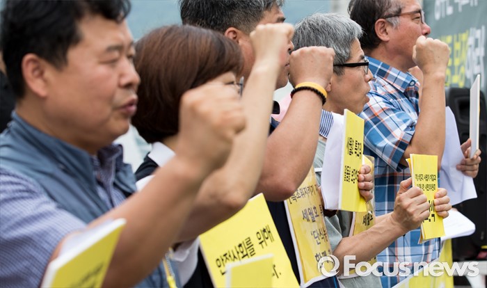 (서울=포커스뉴스) 2일 오전 서울 종로구 광화문광장에서 지하철 비정규직 사망재해 해결과 안전사회를 위한 시민대책위원회가 세월호 특조위 동조단식 돌입 기자회견을 하고 있다.