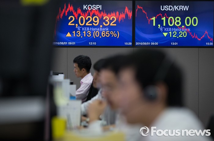(서울=포커스뉴스) 증권·파생상품 시장, 금 시장의 정규장 매매거래 시간이 30분씩 연장된 1일 오후 서울 중구 KEB외환은행 본점 딜링룸에서 딜러들이 업무를 보고 있다. 이날 코스피는 13.42(0.67%) 오른 2,029.61에 마감했으며, 원·달러 환율은 전날보다 12.2원 내린 1108.0원에 거래를 마쳤다.