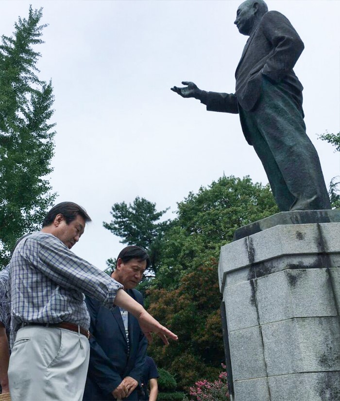 (서울=포커스뉴스) 전국 민생투어 중인 김무성 새누리당 전 대표가 3일 오전 광주 북구 전남방직 공장에 세워진 부친 김용주 전 전남방직 회장의 동상을 찾아 둘러보고 있다. <사진제공=김무성 전 대표 페이스북>