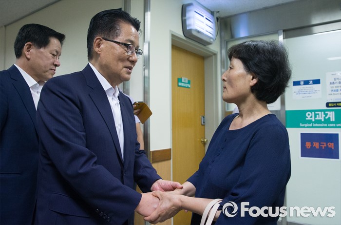 (서울=포커스뉴스) 박지원(왼쪽) 국민의당 비상대책위원장이 2일 종로구 서울대학교병원을 찾아 지난해 민중총궐기 당시 경찰의 물대포를 맞고 입원 중인 백남기 농민을 위로 방문한 뒤 부인 박경숙 여사를 격려하고 있다.