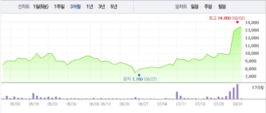 이는 2주 전 주가인 7월19일(9070원)과 비교했을 때 47.73% 상승한 수치다.