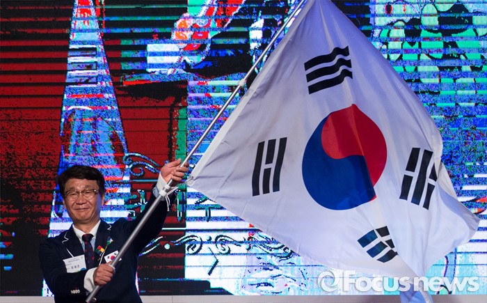 (서울=포커스뉴스) 2일 오후 서울 송파구 올림픽파크텔에서 열린 2016 리우 패럴림픽 대한민국 선수단 결단식에 참석한 정재준 선수단장이 김성일 대한장애인체육회 회장에게 전달받은 태극기를 흔들고 있다.