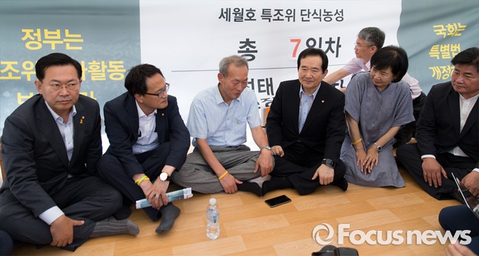 (서울=포커스뉴스) 정세균(오른쪽 세번째) 국회의장이 2일 오전 서울 종로구 광화문광장에서 단식농성 중인 이석태(왼쪽 세번째) 세월호 참사 특별조사위원장과 이야기를 나누고 있다.