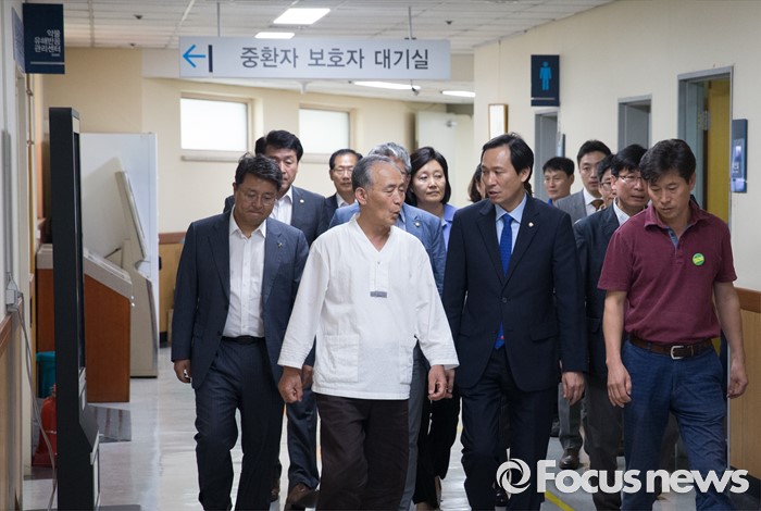 (서울=포커스뉴스) 우상호 더불어민주당 원내대표 등 의원들이 3일 오후 종로구 서울대학교병원을 찾아 지난해 민중총궐기 당시 경찰의 물대포를 맞고 입원 중인 백남기 농민을 위로 방문하기 위해 정현찬 백남기대책위 공동대표의 안내를 받으며 이동하고 있다.