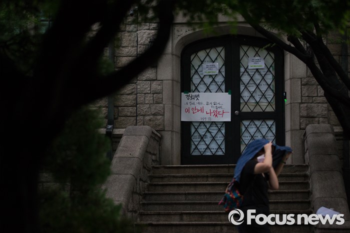 (서울=포커스뉴스) 미래라이프 대학 설립에 반대하는 학생들이 엿새째 이화여대 본관을 점거하고 있는 2일 밤, 서울 서대문구 이화여대 교내에 다양한 목소리의 시위성 글들이 붙어 있다.