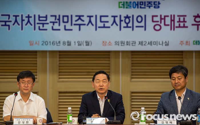 (서울=포커스뉴스) 더불어민주당 전당대회 당대표 출마에 나선 김상곤 후보가 1일 오후 서울 여의도 국회의원회관에서 열린 '전국자치분권민주지도자회의 당대표 후보자 초청 토론회'에 참석해 인사말 하고 있다.