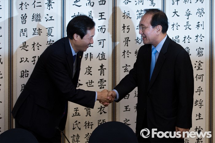 (서울=포커스뉴스) 우상호(왼쪽) 더불어민주당 원내대표와 노회찬 정의당 원내대표가 3일 오전 서울 여의도 국회에서 열린 원내대표 회동에 참석해 악수 하고 있다.