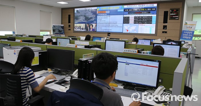 (청주=포커스뉴스) 2016 브라질 리우올림픽을 앞둔 1일 오후 충북 청주 흥덕구 오송 질병관리본부에 설치된 리우올림픽 감염병 대응 긴급상황실에서 관계자들이 지카바이러스 감염병 발생 동향 등을 살피고 있다.