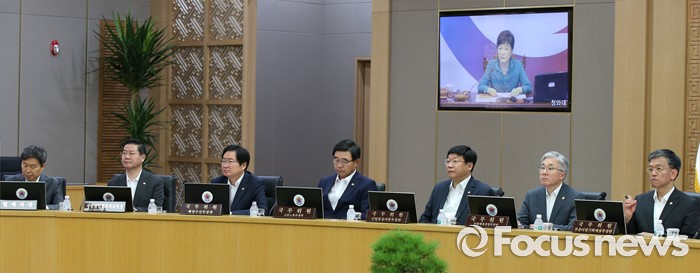 (세종=포커스뉴스) 2일 오전 세종시 정부세종청사 국무회의장에서 열린 청와대-세종 영상 국무회의에서 국무위원들이 박근혜 대통령의 모두발언을 듣고 있다.