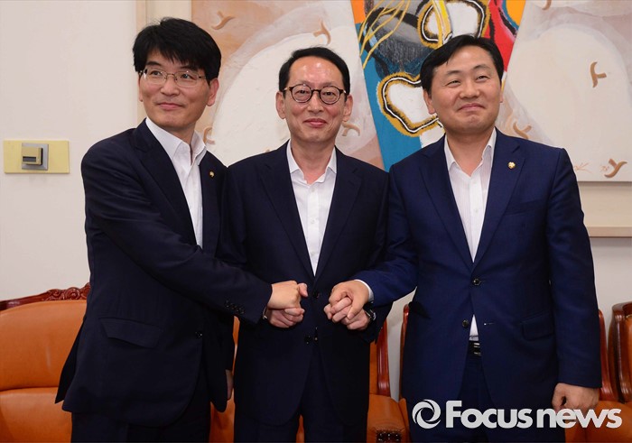 (서울=포커스뉴스) 1일 서울 여의도 국회에서 여야3당 원내수석부대표가 8월 임시국회 세월호 특별법 연장과 추경 등 현안 관련 공조 협의를 위한 회동에서 손을 맞잡고 있다. 왼쪽부터 더불어민주당 박완주, 새누리당 김도읍, 국민의당 김관영.