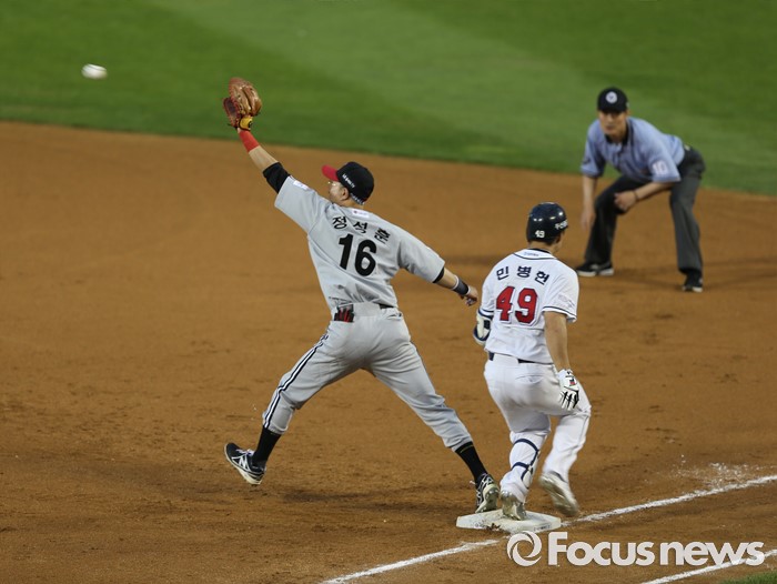 (서울=포커스뉴스) 2일 오후 서울 잠실구장에서 열린 2016 프로야구 LG-두산 경기 3회말 1사 1,2루 상황, 민병헌이 유격수 왼쪽 내야안타를 치고 1루 베이스르 향해 돌진하고 있다.