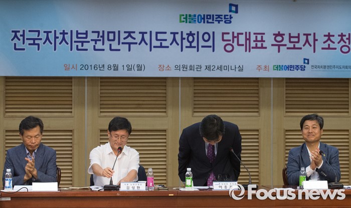 (서울=포커스뉴스) 1일 오후 서울 여의도 국회 의원회관에서 열린 더불어민주당 자치분권민주지도자회의 당대표 후보자 초청 토론회에 참석한 이종걸(왼쪽 세번째) 의원이 인사하고 있다.