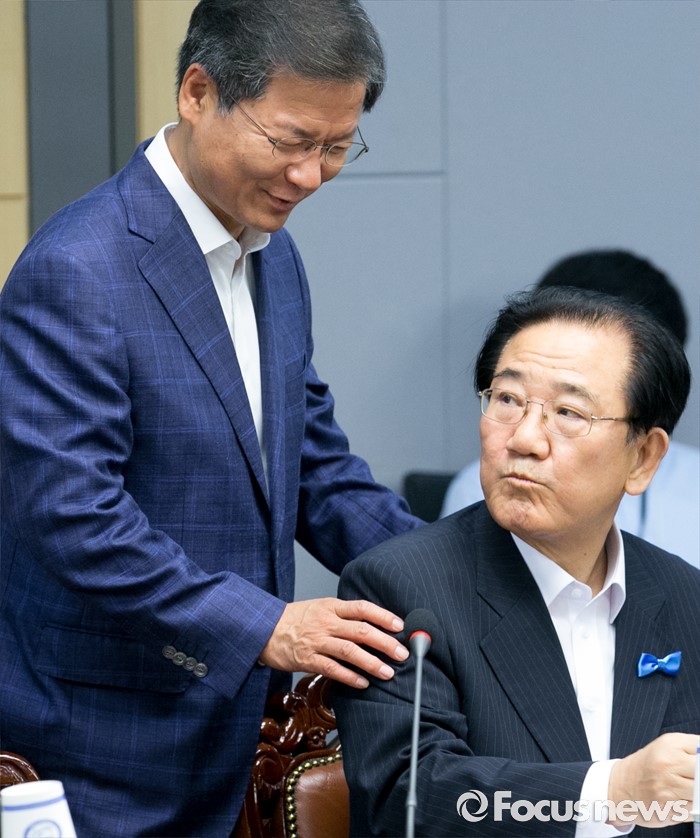 (서울=포커스뉴스) 2일 오전 서울 여의도 국회 의원회관에서 열린 국민의당 의원총회에 참석한 천정배(왼쪽) 전 공동대표와 박준영 의원이 인사하고 있다. 검찰은 수억 원대 공천헌금을 수수한 혐의로 박준영 의원에 대해 구속영장을 재청구했지만 기각됐다.