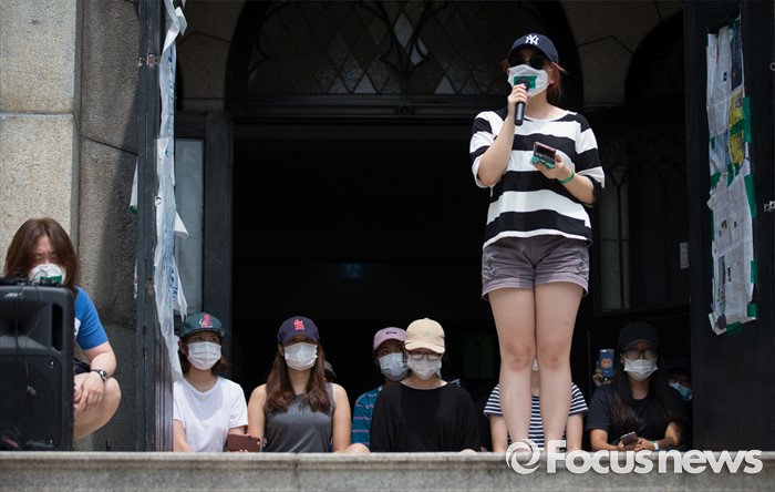 (서울=포커스뉴스) 3일 오후 서울 서대문구 이화여자대학교 본관 앞에서 평생교육 단과대학 '미래라이프대학 설립 철회 소식을 들은 이화여대 학생들이 완전 철회가 확인될 때까지 "농성을 당장 중단하지는 않을 것"이라며 성명서를 발표하고 있다.