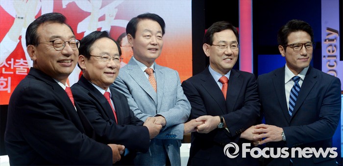 (서울=포커스뉴스) 2일 오후 서울 상암동 MBC 스튜디오에서 열린 '새누리당 대표 경선 TV토론회'에 참석한 의원들이 포즈를 취하고 있다. 왼쪽부터 이정현, 이주영, 한선교, 주호영, 정병국 의원.