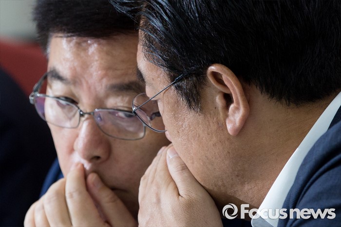 (서울=포커스뉴스) 정진석(오른쪽) 새누리당 원내대표와 김광림 정책위의장이 2일 오전 서울 여의도 국회에서 열린 원내대책회의에 참석해 의견을 나누고 있다.