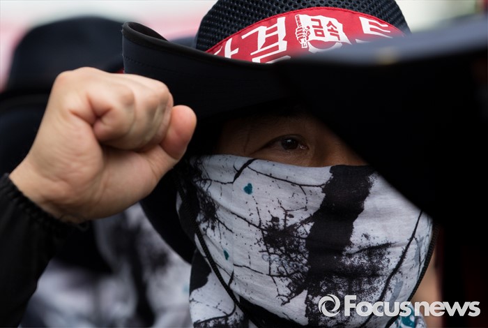 (아산=포커스뉴스) 1일 오후 충남 아산 탕정면 갑을오토텍에서 노조원들이 사측 경비 용역 진입을 반대하며 구호를 외치고 있다.