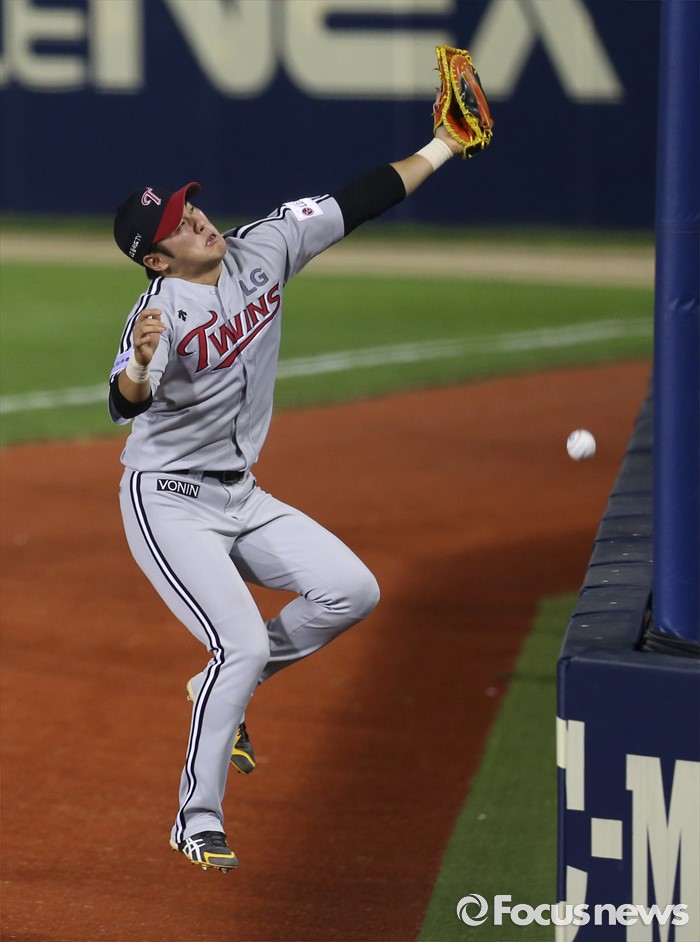 (서울=포커스뉴스) 3일 서울 잠실구장에서 열린 2016 프로야구 LG-두산 경기 7회말 1사 1,2루에서 LG 1루수 양석환이 두산 허경민의 파울 타구를 잡으려 펜스 앞에서 점프했으나 놓치고 있다.