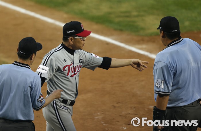 (서울=포커스뉴스) 2일 오후 서울 잠실구장에서 열린 2016 프로야구 LG-두산 경기 3회말 1사 2루에서 두산 김재호가 류지혁의 2루 땅볼에 런다운에 걸려 LG 히메네스에 태그아웃 당했지만 박재욱의 주루 방해로 세이프 판정이 나자 양상문 감독이 그라운드에 나와 심판진과 이야기를 나누고 있다.