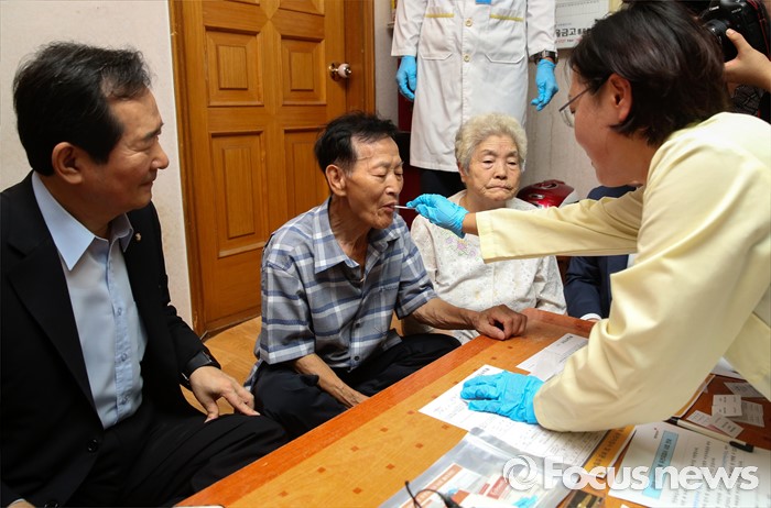(서울=포커스뉴스) 정세균 국회의장이 2일 오전 서울 종로구 창신동에 거주하고 있는 고령 이산가족 김문각 할아버지(84세, 평안남도 양덕군 청계리) 가정을 방문해 김 할아버지의 이산가족 상봉 준비를 위한 유전자 채취 과정을 지켜보고 있다.