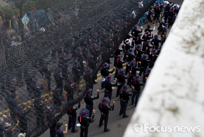 (아산=포커스뉴스) 1일 오후 충남 아산 탕정면 갑을오토텍에서 노조원들과 사측 경비 용역들이 대치하고 있다.
