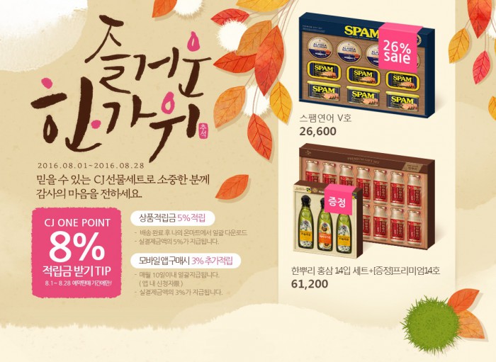 CJ온마트에선 스팸연어 선물세트를 할인 판매한다. 할인 판매하는 제품을 제외한 다른 선물세트를 구매하는 소비자들에겐 백설 고급유 선물세트를 2000개 선착순 증정한다. 또 상품금액의 5%를 적립금으로 지급하고, 모바일 앱 구매자에겐 3%를 추가로 적립해주는 이벤트를 실시한다.