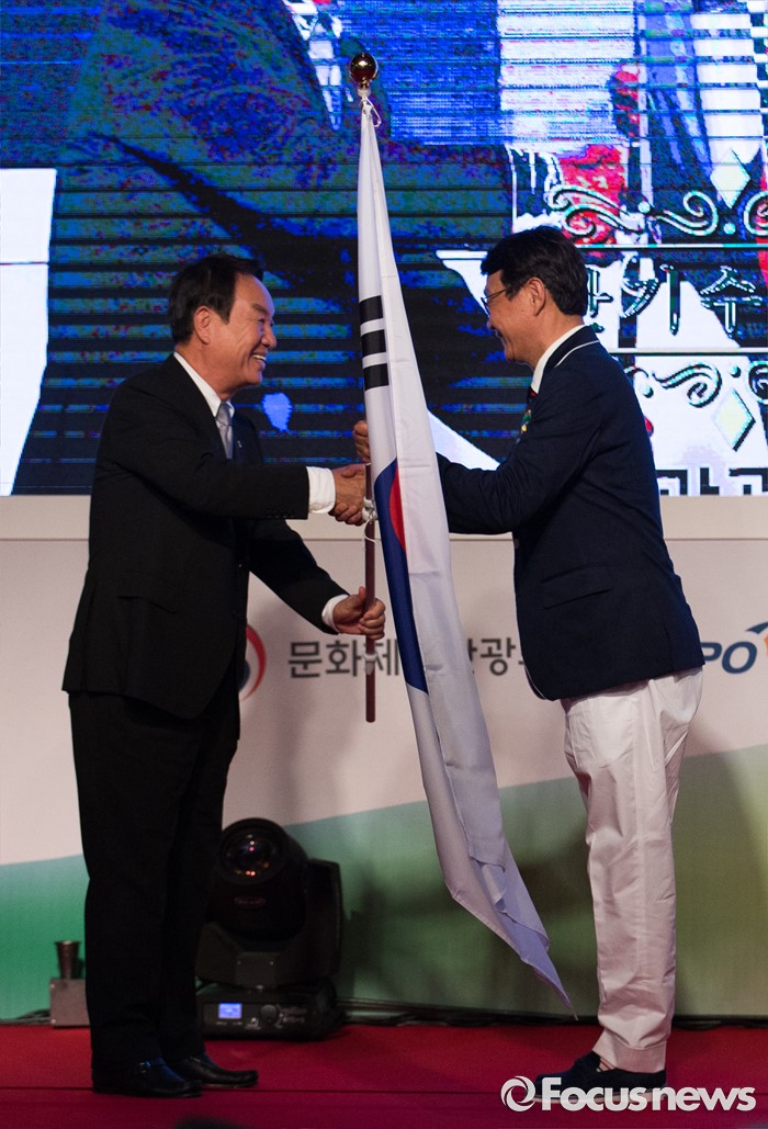 (서울=포커스뉴스) 2일 오후 서울 송파구 올림픽파크텔에서 열린 2016 리우 패럴림픽 대한민국 선수단 결단식에 참석한 김성일(왼쪽) 대한장애인체육회 회장이 정재준 선수단장에게 태극기를 전달하고 있다.