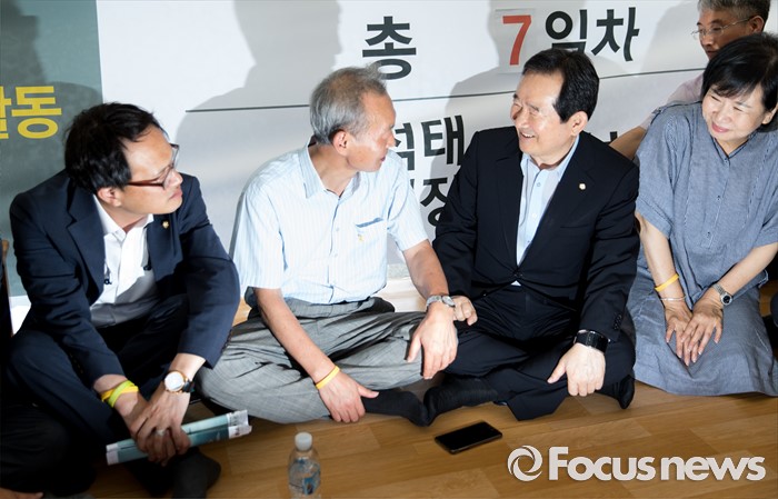 (서울=포커스뉴스) 정세균(오른쪽 두번째) 국회의장이 2일 오전 서울 종로구 광화문광장에서 단식농성 중인 이석태(왼쪽 두번째) 세월호 참사 특별조사위원장과 이야기를 나누고 있다.