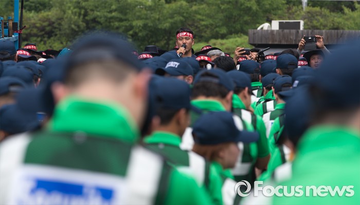 (아산=포커스뉴스) 1일 오후 충남 아산 탕정면 갑을오토텍에서 노조원들과 사측 경비 용역들이 대치하고 있다.
