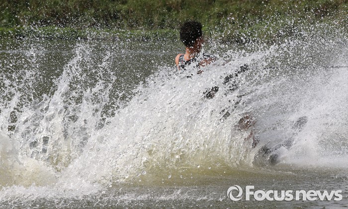 (공주=포커스뉴스) 3일 오후 충남 공주시 금강변에서 수상스포츠전문가들이 스상스키를 타며 물살을 가르고 있다.