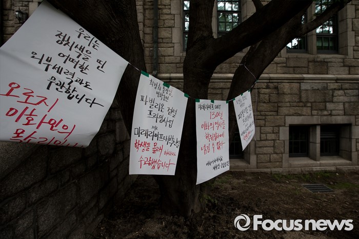 (서울=포커스뉴스) 2일 오전 서울 서대문구 이화여대 교내에 미래라이프 단과대학 설립에 반대하는 문구가 부착돼 있다.
