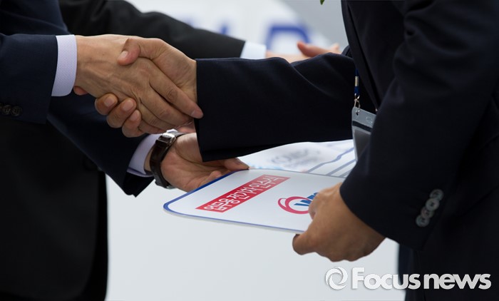 (서울=포커스뉴스) 2일 오후 서울 마포구 상암월드컵경기장에서 개방형 전기차 충전소 1호 착공식에 참석한 내빈들이 전기차 인수식을 하고 있다.